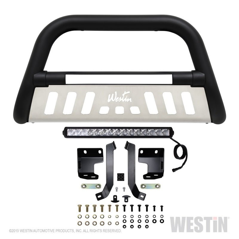 Westins Ultimate LED Bull Bar will take your truck to the next level with this cool new look! The integrated light bar is a 20 single row with 15 x 3 Watt Osram LEDs. The LED light bar is flush mounted in the center cross tube and weather sealed for moisture resistance. Built with 3 steel tubes, our Ultimate LED Bull Bar features molded transition bushings and a brushed stainless steel skid plate for a perfect look. The product is available in chrome plated stainless steel backed by a lifetime warranty, and in textured black powder coat backed by a 3-year warranty. Make a bold statement with Westins new Ultimate LED Bull Bar and give your truck the durability, look and style it deserves.